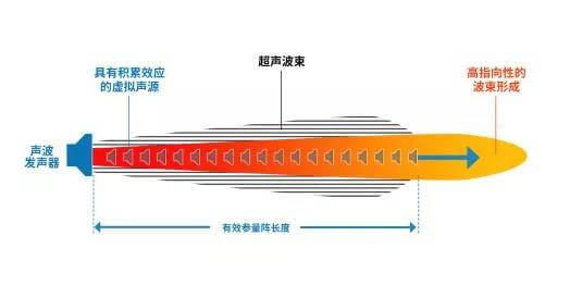 定向聲技術的核心是基于超聲換能器的定向傳播技術,其基本原理是以超聲波為載波信號,搭載可聽聲,通過超聲換能器發射到空氣中,利用空氣的非線性作用,借助特定方法的信號算法處理,讓可聽聲像超聲波一樣,以波束的形式向一個方向集中傳播,實現傳說中的“定向傳音”。