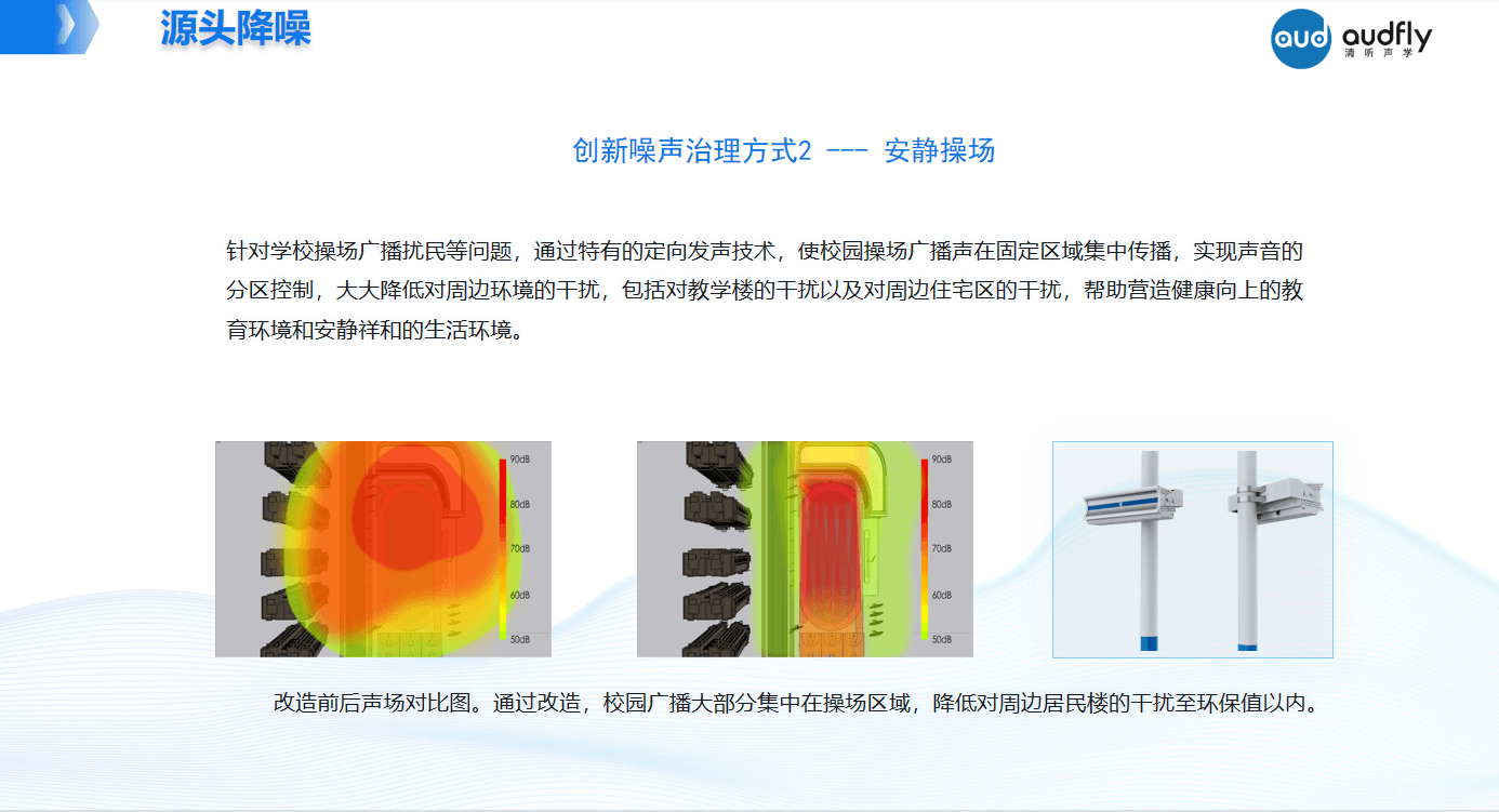 從源頭降噪方面,不擾民的智慧廣場舞系統(tǒng)、校園安靜操場、道路定向聲預(yù)警系統(tǒng)等方案,均可實(shí)現(xiàn)聲音在固定區(qū)域指向性播放。確保多舞隊(duì)同時(shí)跳舞都能獨(dú)立音區(qū)、舞隊(duì)之間互不干擾,降低對附近居民樓的干擾至環(huán)保值以內(nèi);確保校園操場廣播聲分區(qū)控制,大大降低對教學(xué)樓、周邊住宅區(qū)等周邊環(huán)境干擾,幫助營造健康向上的教育環(huán)境和安靜祥和的生活環(huán)境;在高速道路實(shí)現(xiàn)廣播信息在固定精準(zhǔn)傳播,實(shí)現(xiàn)信息發(fā)布的同時(shí),降低對周邊環(huán)境造成額外噪聲干擾。