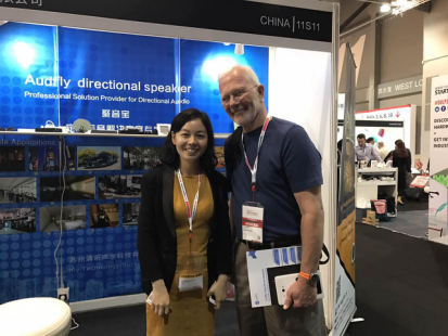 來自香港的toni lin高興地表示,聚音寶可以幫助他們解決商場外面音樂會的噪音問題;日本客戶說道,在廣告行業(yè),聚音寶定向音響大有用武之地;來自美國一家公司的CEO Michael Yap更是現(xiàn)場發(fā)出邀約。